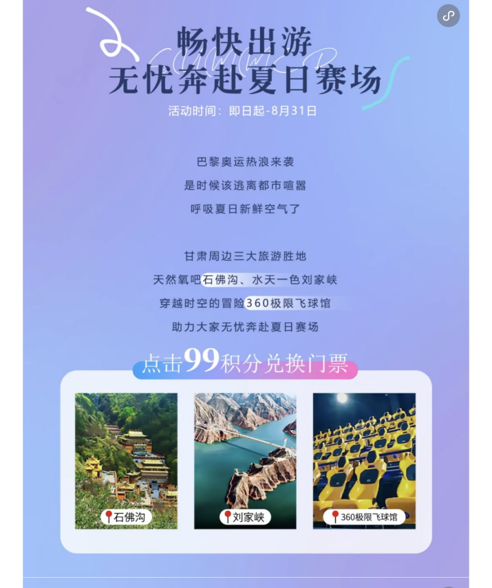 首期活動(dòng),運(yùn)營集團(tuán)精選蘭州石佛溝國家森林公園(國家AAAA級(jí)旅游景區(qū))、劉家峽恐龍國家地質(zhì)公園(國家AAAA級(jí)旅游景區(qū))及蘭山360極限飛球三家景區(qū)場館參與活動(dòng)。期間,吾悅廣場室內(nèi)外大屏也將滾動(dòng)播放景區(qū)場館的宣傳影片,供廣大消費(fèi)者了解景區(qū)場館詳細(xì)信息。后續(xù),運(yùn)營集團(tuán)將根據(jù)市場反饋與實(shí)際情況,不斷調(diào)整、更新活動(dòng)場館,為廣大消費(fèi)者帶來更加豐富多元、新鮮有趣的旅游體驗(yàn)。